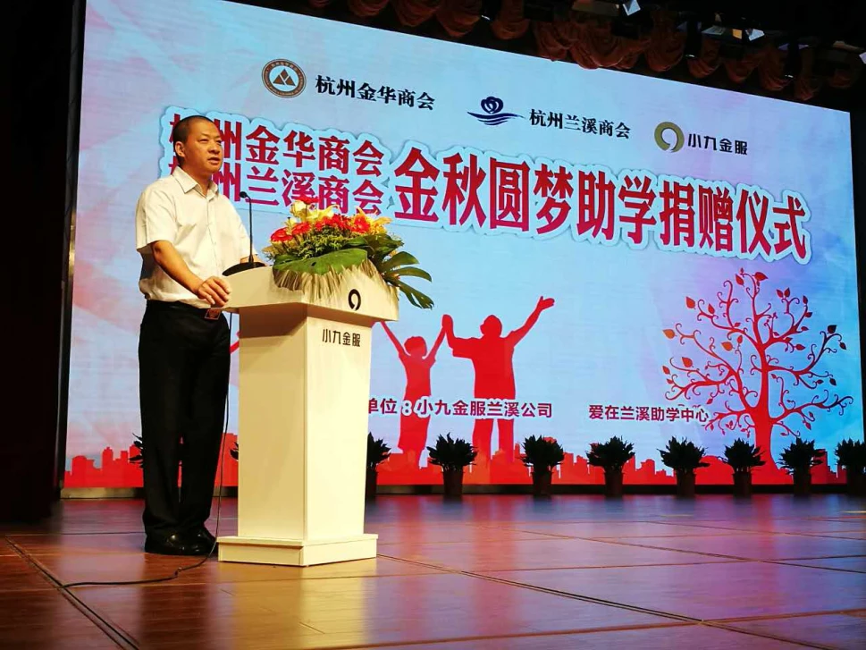 在捐助仪式和开业庆典上,吕金土作了热情洋溢的致辞。他首先代表杭州金华商会向小九金服兰溪公司的开业表示热烈的祝贺,祝愿公司开业大吉并在服务兰溪经济发展和百姓生活幸福中,打响品牌、树立形象、建功立业。他指出,小九金服兰溪公司开业和爱心助学活动的举行,体现了商会企业家回馈家乡、回报社会的可贵精神。所举行的这个仪式,既是小九金服兰溪公司的开业助力兰溪经济发展的开始,更是金华和兰溪在杭两家商会广大会员帮助兰溪困难学子“梦圆学业”的开始,深深蕴含着祝愿兰溪广大学子“旭日东升”,祝愿兰溪经济社会发展“旭日东升”,祝愿小九金服兰溪公司“旭日东升”。
