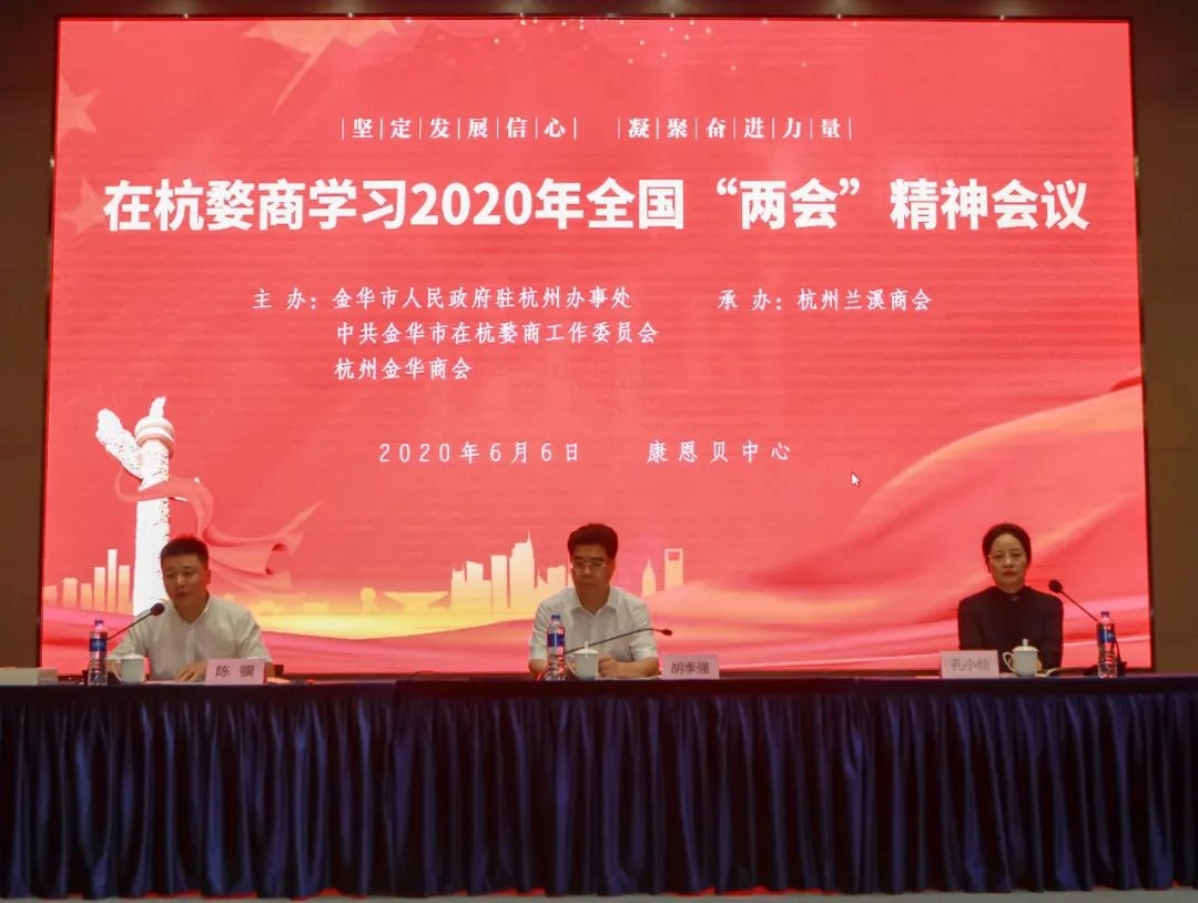 2020年6月6日下午,由金华市人民政府驻杭州办事处、中共金华市在杭婺商工作委员会、杭州金华商会联合主办,杭州兰溪商会承办的在杭婺商传达学习全国“两会”精神会议,在位于滨江的康恩贝中心举行。会议邀请全国人大代表、杭州金华商会名誉会长、康恩贝集团董事长胡季强为与会人员传达全国“两会”精神,杭州金华商会执行会长、杭州嘉银投资有限公司董事长孔小仙出席会议并讲话,金华市在杭婺商党工委书记、金华市人民政府驻杭州办事处主任陈骥主持会议。
